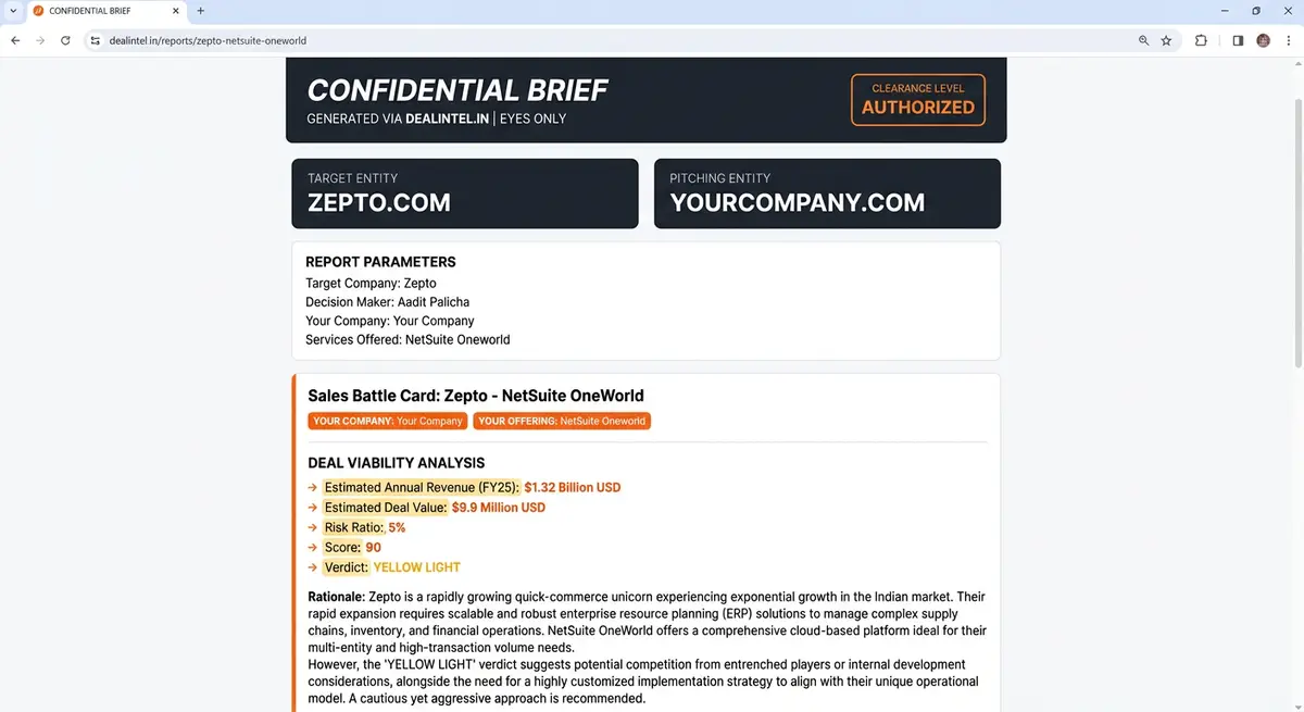 Sales professionals use DealIntel to research prospects 10x faster. Stop spending 45 minutes researching. Get revenue data, tech stack analysis, and custom pitch angles in 1 minute.